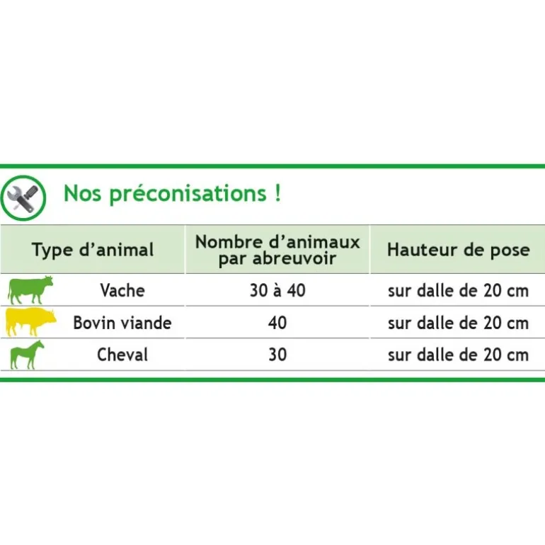 – 1 flotteur 42L/min à corps laiton, raccordement 3/4″ situé sous l’abreuvoir,