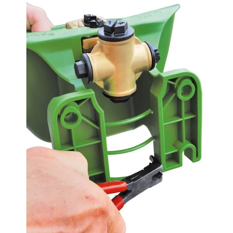 A noter : il est possible de couper les liens entre les pattes de fixation pour pouvoir poser ou déposer facilement l’abreuvoir du mur lors d’une alimentation par le dessous.
