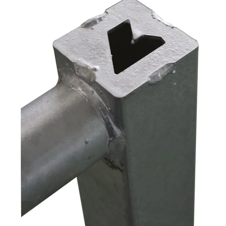 – Plat de fixation de partie arrière de barrière emboutie Embout avant un verrou Ø 20 mm, anti-retour dans l’axe des lisses.