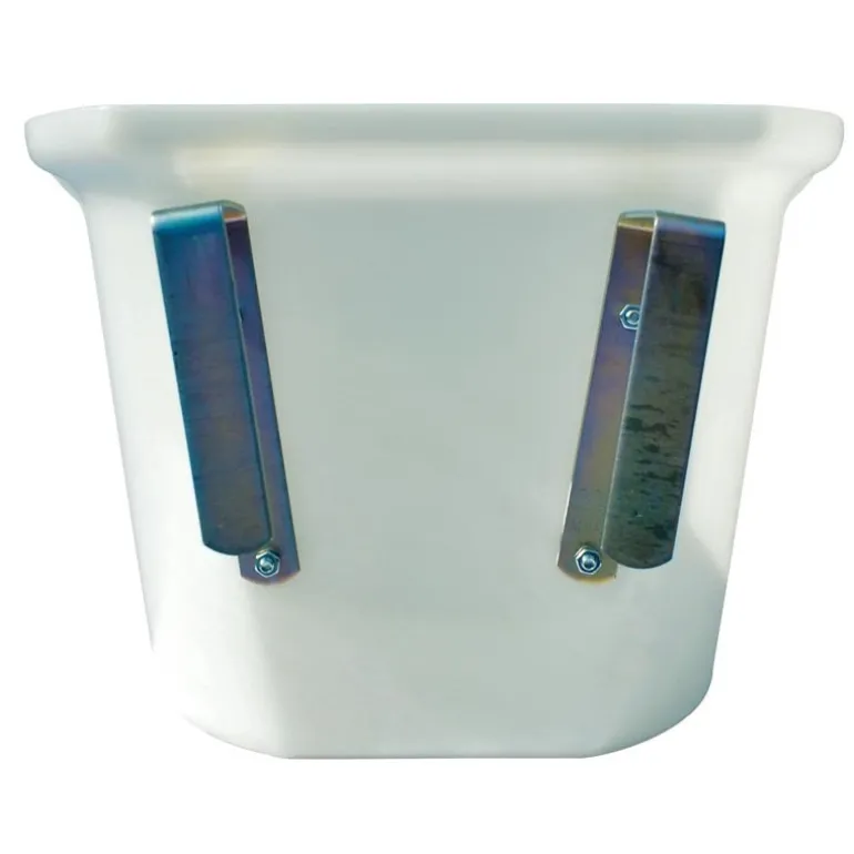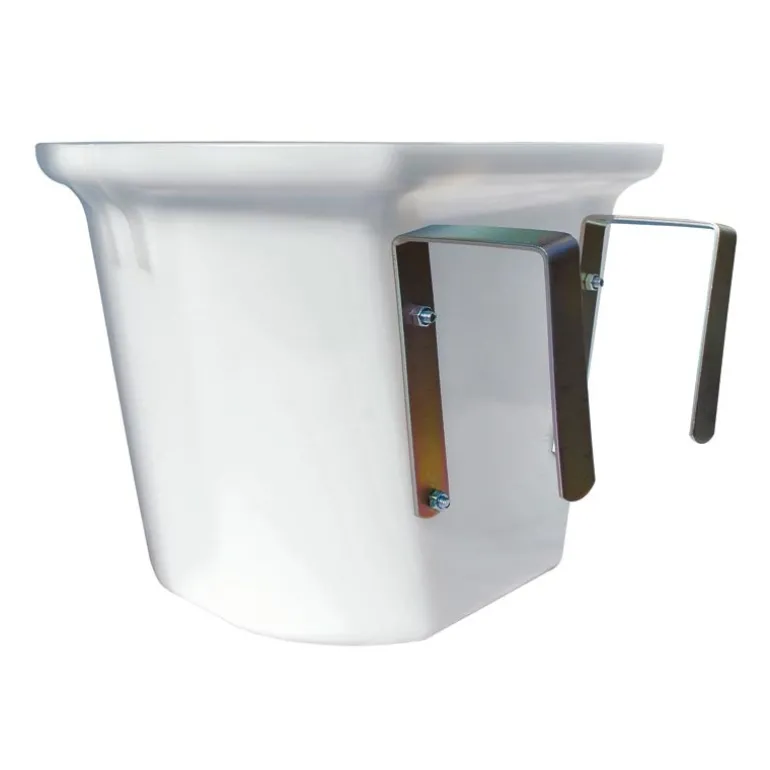 2 crochets boulonnés en acier galvanisé positionnés à l’arrière de la mangeoire offrent un très bon maintien sur son support de pose et par leur forme sont non blessantes pour l’animal.