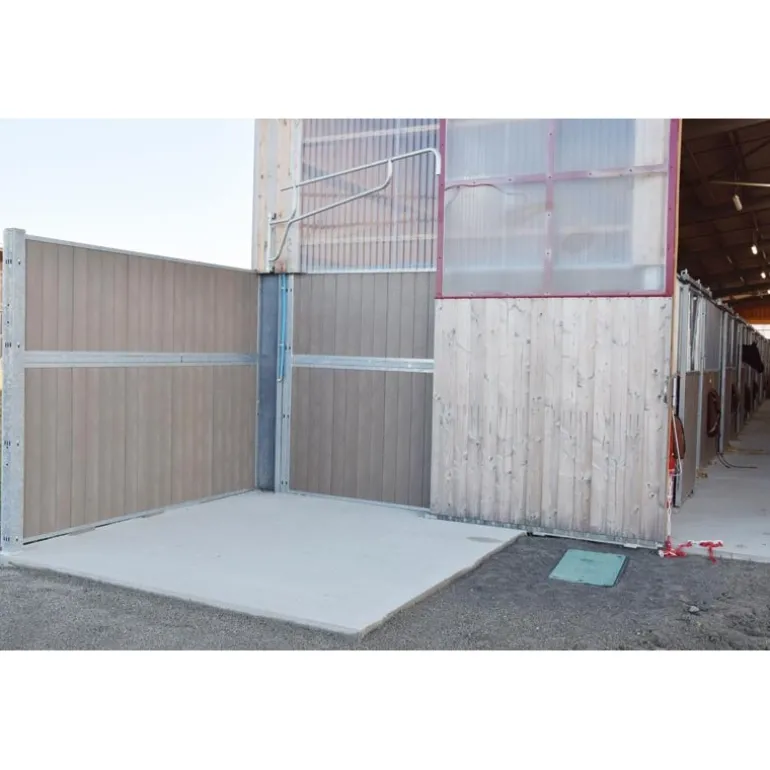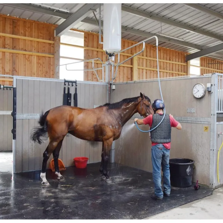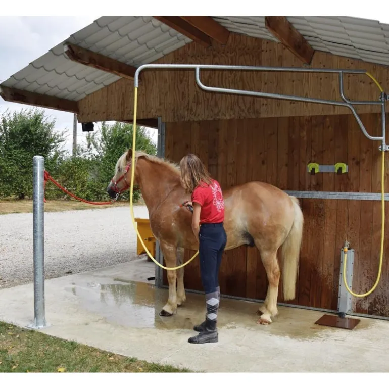 Support de douche pour chevaux. Il permet de surelever et déporter un tuyau d’arrosage dans le tube afin de se déplacer autour du cheval et le nettoyer sans déplacer sans cesse le tuyau. Fixation murale à adapter en hauteur selon la taille des chevaux.