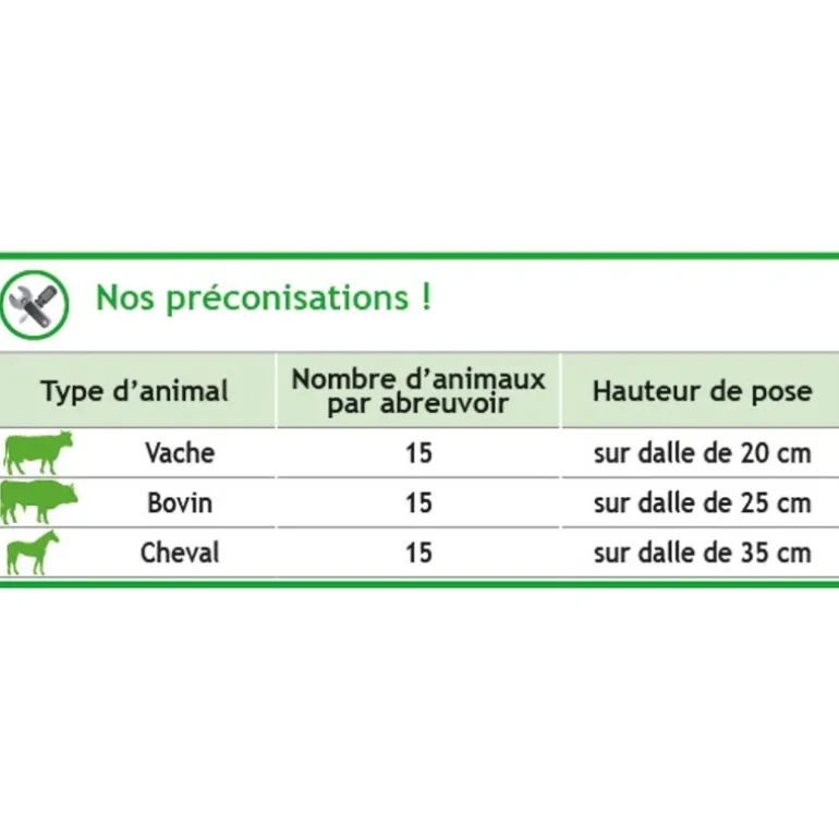 Il est indispensable d’installer le Polytherme sur une dalle en béton d’au moins 20 à 35 cm de hauteur selon le type d’animal, dépassant de 5 à 10 cm tout autour de l’abreuvoir.