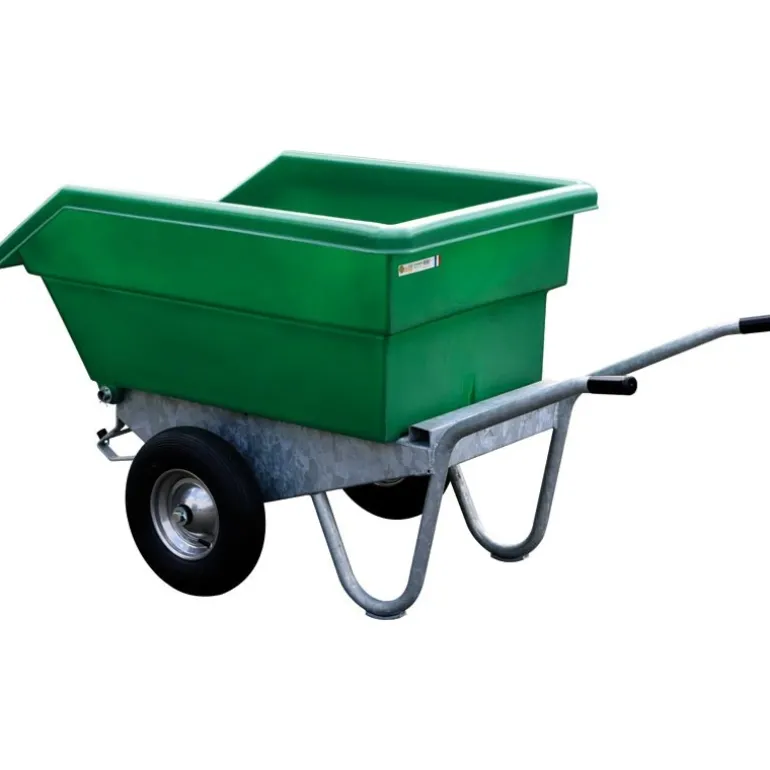 Ces brouettes sont conçues à partir d’un châssis galvanisé à basculement intégral et d’une cuve en résine de polyéthylène stabilisé aux UV et au gel. Equipées de roues de 400 x 8 – 4 plys gonflables sur roulement à rouleaux graissés avec épaulement de 80 mm, jantes métalliques (hors modèle 200 L).