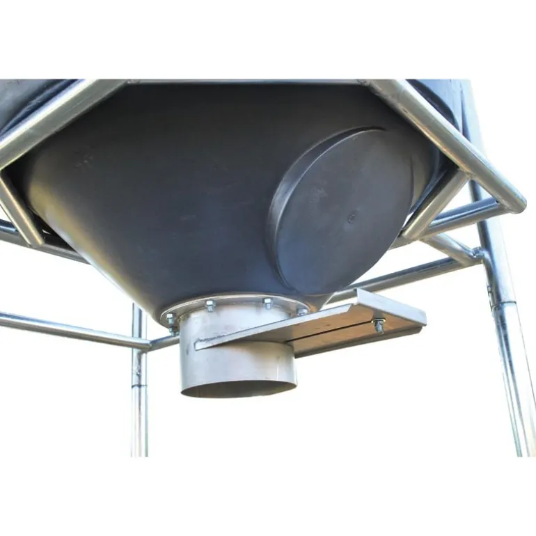 – Trappe inox, Ø 200 mm, montée d’origine sur la partie basse du cône déporté, permet la reprise de l’aliment directement au godet de tracteur depuis l’avant des silos ou par chariot à aliment.
