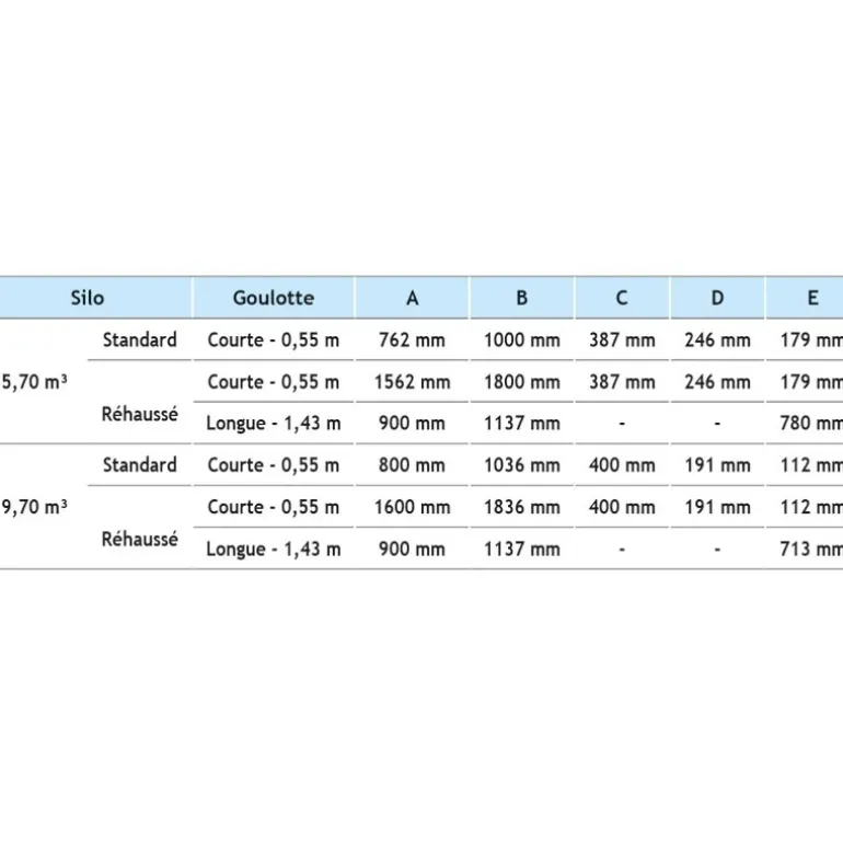 Ces silos sont prévus pour le stockage intérieur et extérieur des aliments (densité 0,8 maximum).