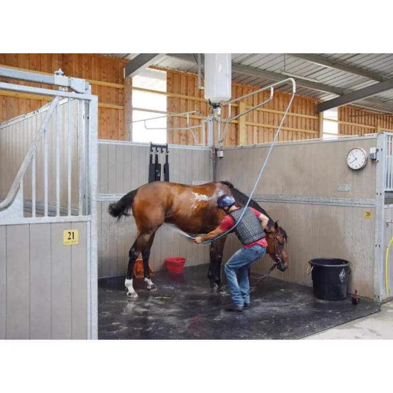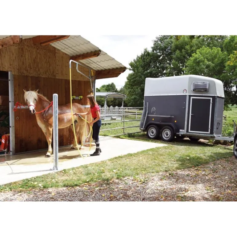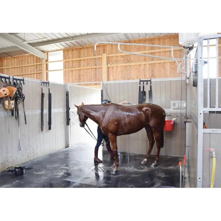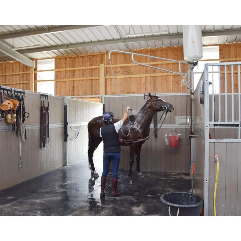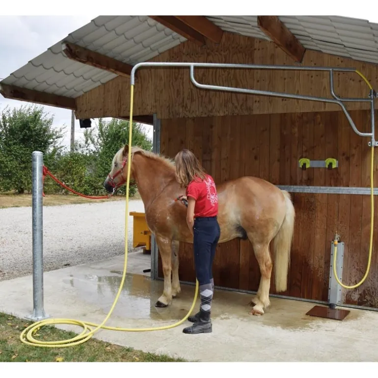 Support de douche pour chevaux. Il permet de surelever et déporter un tuyau d’arrosage dans le tube afin de se déplacer autour du cheval et le nettoyer sans déplacer sans cesse le tuyau. Fixation murale à adapter en hauteur selon la taille des chevaux.